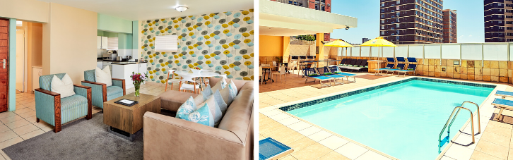 Located in the heart of Durban city, the luxurious, fully-equipped and serviced apartments offer all the amenities needed to ensure a comfortable stay, including delicious cuisine from La Vita restaurant, games room, sauna and onsite pool and Jacuzzi, as well as a communal braai area to delight all you carnivores out there.