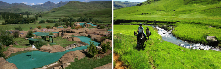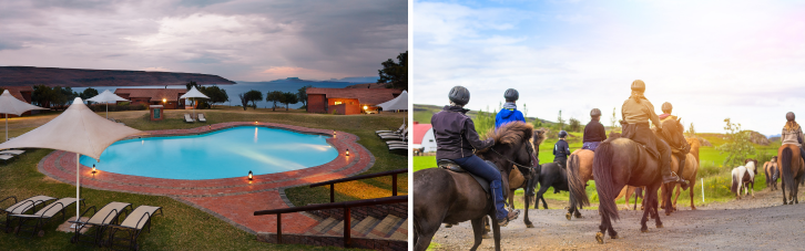 1. Bushman’s Nek: Nestled in the stunning foothills of the Southern Drakensberg, Bushman’s Nek blends luxury, adventure, and serene landscapes. Offering a variety of accommodation options from hotel rooms and rustic log cabins to self-catering apartments, it’s a haven for those seeking relaxation or outdoor excitement. Indulge in the wellness spa, savour delectable cuisine, or engage in activities like horse riding, paintball, and hiking, all set against the breathtaking backdrop of the Drakensberg mountains, making it an unforgettable retreat for family fun and adventure seekers alike.