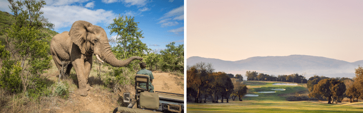 Kruger Park Lodge and Kruger National Park:Kruger Park Lodge, located near the famed Kruger National Park, combines a serene golfing experience with spectacular wildlife viewing. The lodge features a Gary Player-designed 9-hole golf course, set amidst traditional Lowveld scenery with roaming impalas and a variety of leisure facilities including tennis courts, pools, and a hippo hide. Just steps away, the vast Kruger National Park offers an unrivalled wildlife experience, home to hundreds of animal species and rich historical sites.